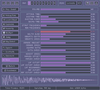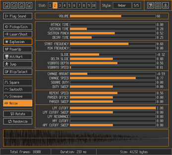 wow, this tool is super cool (and I love your GUI style too). I tried it out and it made some pretty cool sound effects for my game. Thanks for making this, I found it very helpful :)