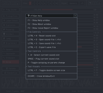 Sounds could be saved as .rfx (sound generation parameters) and also exported to .wav, .raw (samples data) and .h (byte array code file).