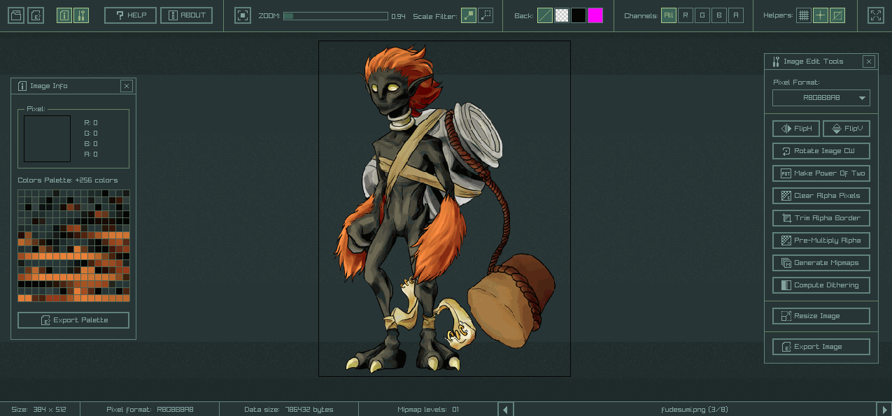 rTexViewer arrives in two flavours: rTexViewer ZERO (free version) and rTexViewer ONE (low-cost version). Details for each version are provided on tool description page but main differences for version ONE are the addition of command-line usage mode and additional import/export image formats supported.